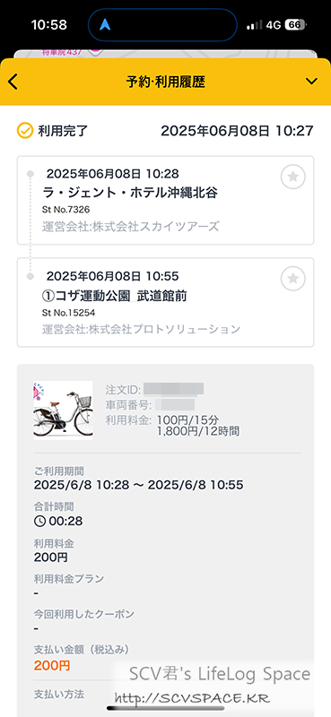 먼저도 언급했듯 30분 넘어가기 전에 반납 성공했습니다. 카드로 200엔 승인온거 보면서 마음편히 숙소로.