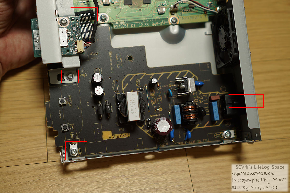 전면 디스플레이를 고정하는 프레임 위쪽도 같이 빼셔야 전원부 기판 분해가 쉬울 겁니다. 안그러고 하려니 뺄때 걸리는게 많던.