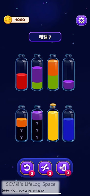 이쪽은 병에 들은 페인트를 한가지 색으로 채우면 사라지는 류의 캐쥬얼 게임. 위랑 계통은 비슷합니다.