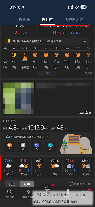 사소한 부분이긴 한데, 우리나라는 금요일(2/6) 부터지만 일본은 그 다음날부터 상층 찬공기의 영향을 받습니다.