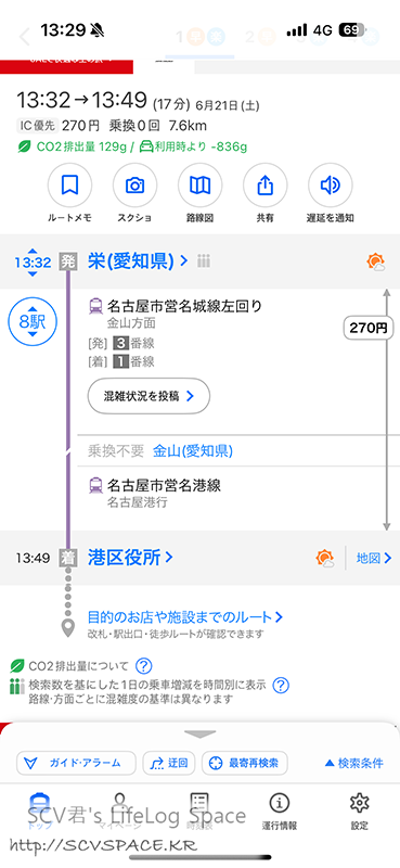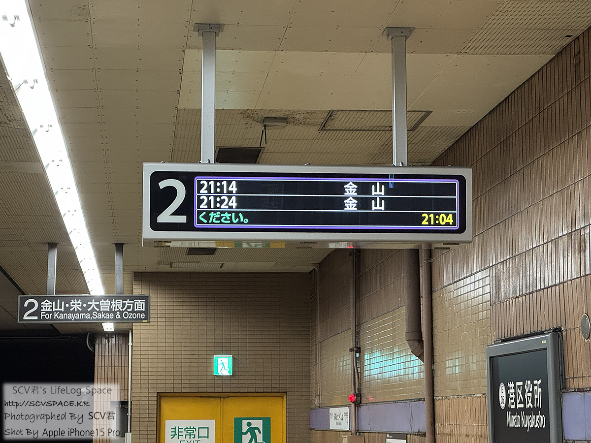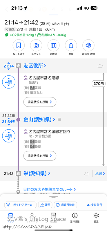 혹시나 하고 앱으로 조회해보니 맞네요, 시간이 늦어서 그런가 중간에 한번 갈아타야 사카에까지 갑니다.