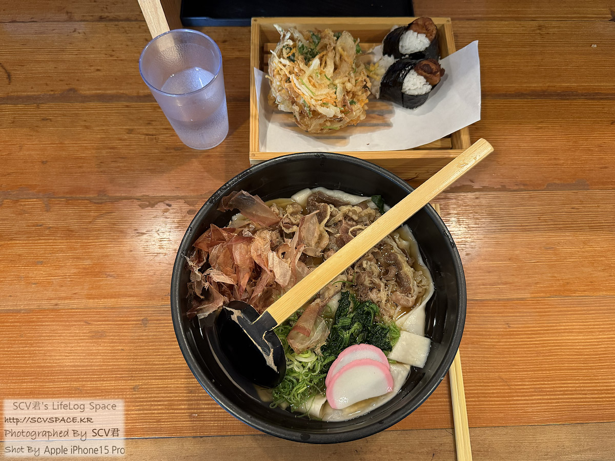 (2025.12 정도부터 가격 올랐습니다. 소고기 키시멘 1,280엔, 튀김+텐무스 세트 680엔 도합 1,960엔 - 런치 등 세트 고려안한 단품기준)