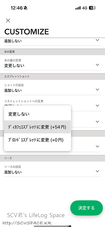 한국 스타벅스도 처리는 일반 커피의 디카페인 옵션 선택 상태지만, 일본 스타벅스는 이 프리셋(디카페인 메뉴)도 전면에 없습니다.
