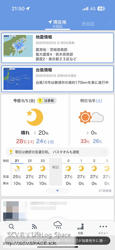 일본 여행용 아이폰이라 현지용 날씨앱을 깔아두고 있어서, 수도권의 태풍속보들이 계속 밀려들더군요.