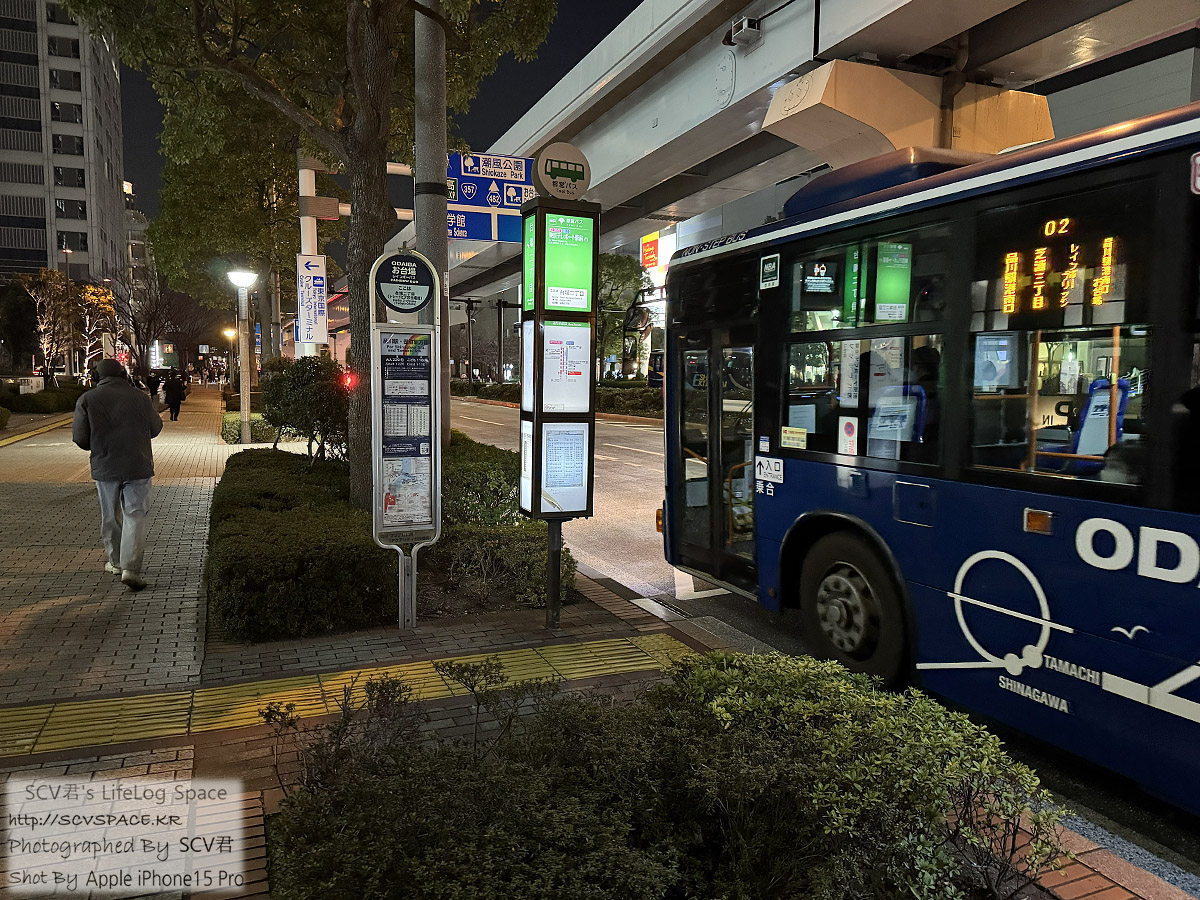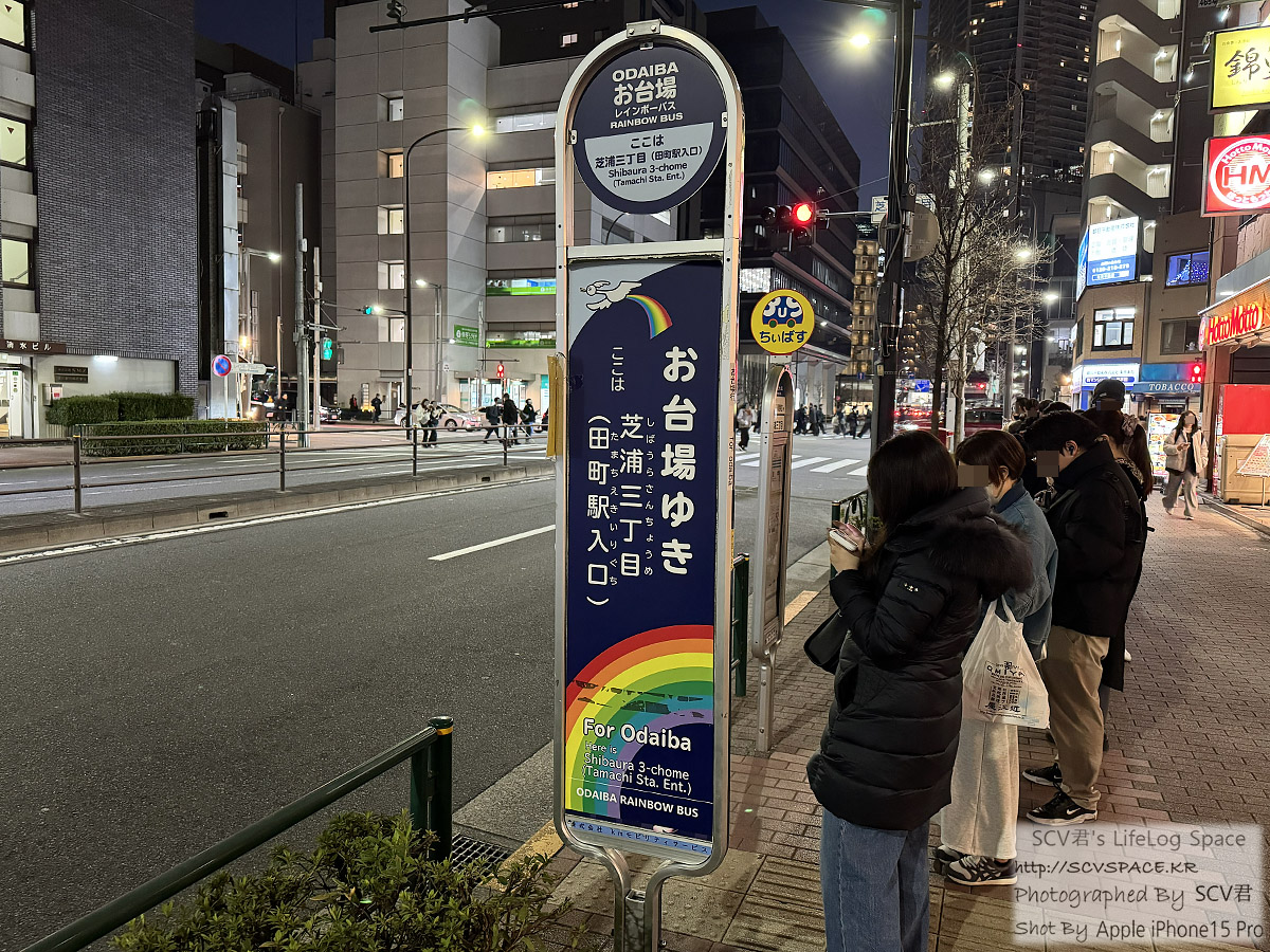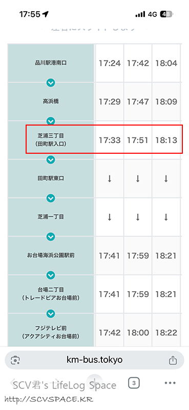 그리고 17:51 시간표상 도착시간에 레인보우 버스 타마치 정류장에 도착 [시간표, 평일 기준 위에서 세번째 정류장 芝浦三丁目]