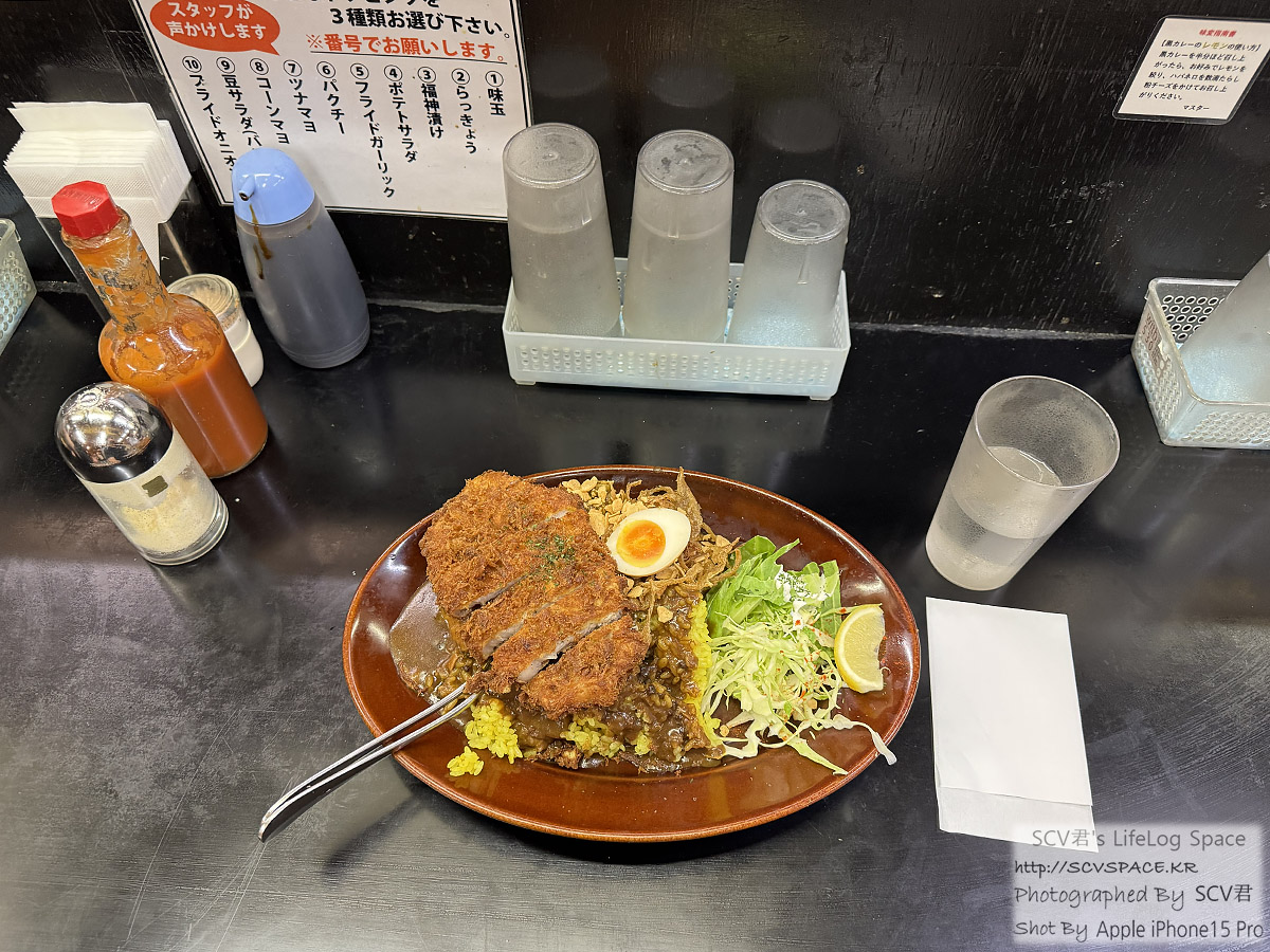 제가 주문한건 黒い肉カレー 中盛(990엔), 유료토핑 トンカツ(360엔)
