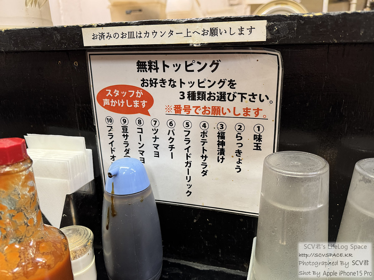 무료토핑은 1 아지타마(반개), 5 프라이드 갈릭(구운마늘), 10 프라이드 어니언(구운양파)