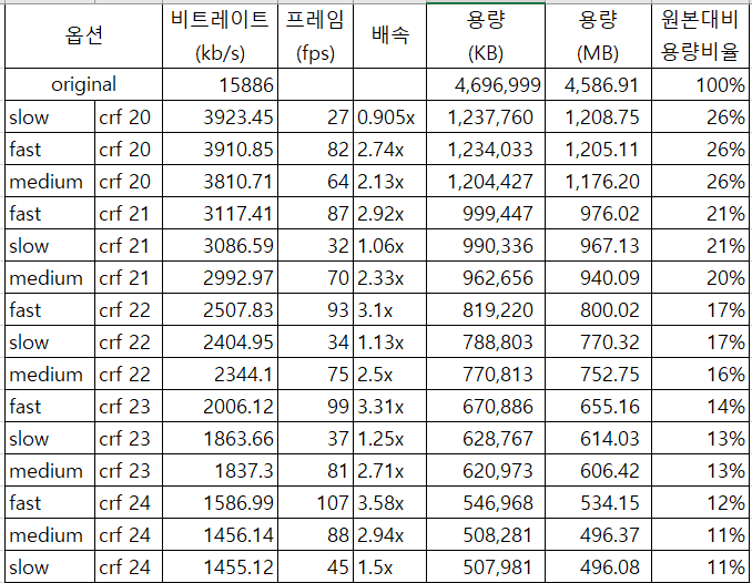 preset fast + crf 20 옵션을 사용하기로 했습니다.